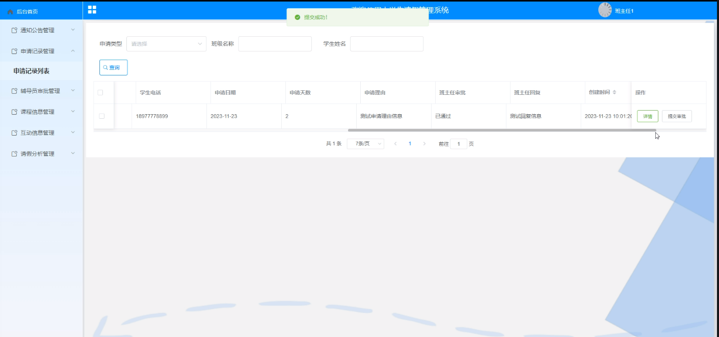 - 申请记录管理:点击“申请记录管理”后跳转到申请记录提交界面,选择申请标题、申请类型、班主任用户、学生用户、班级名称、学生姓名、学生学号、学生电话、申请日期、申请天数、申请理由、班主任审批、班主任回复,然后点击提交申请记录就完成了。