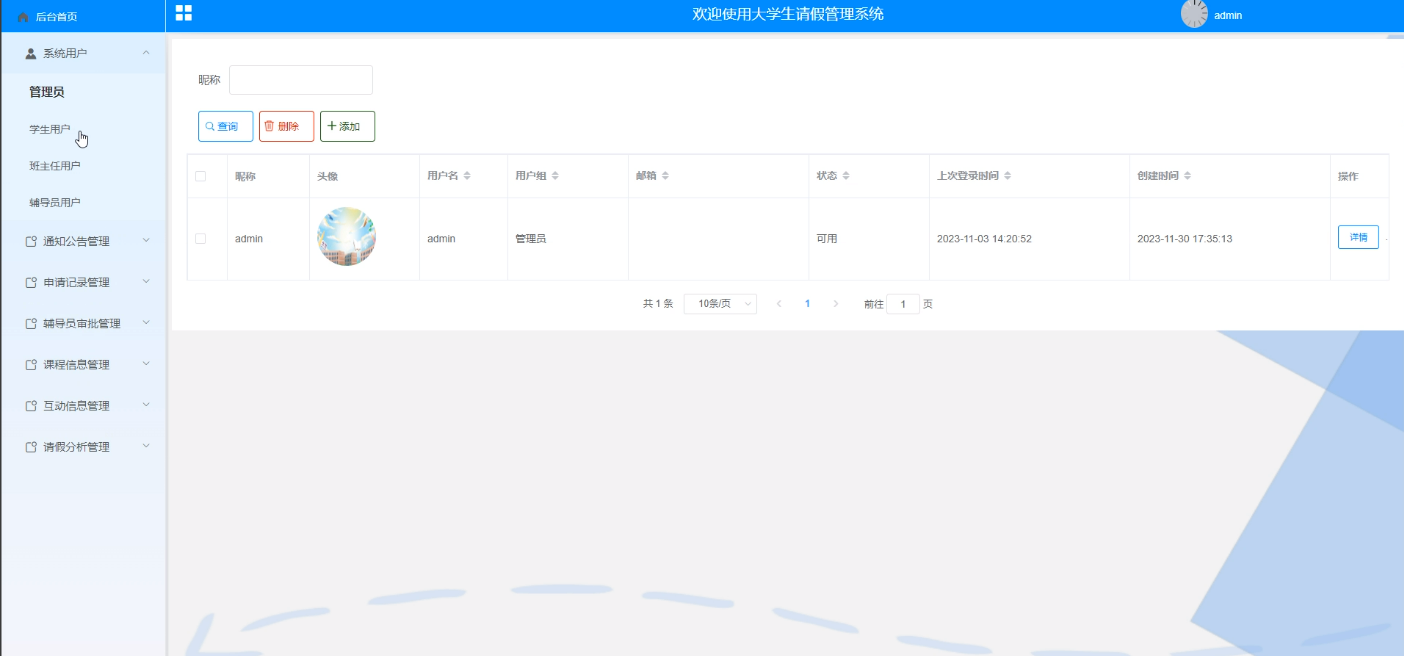 (3)用户管理:管理员可以对大学生请假管理系统中的管理员、班主任、辅导员以及前台注册的学生用户进行审核管理。
