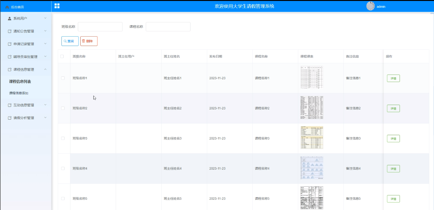 (6)课程信息管理:可以查看到班主任用户提交的课程安排,可通过web端直接为其查询、添加、删除等操作;