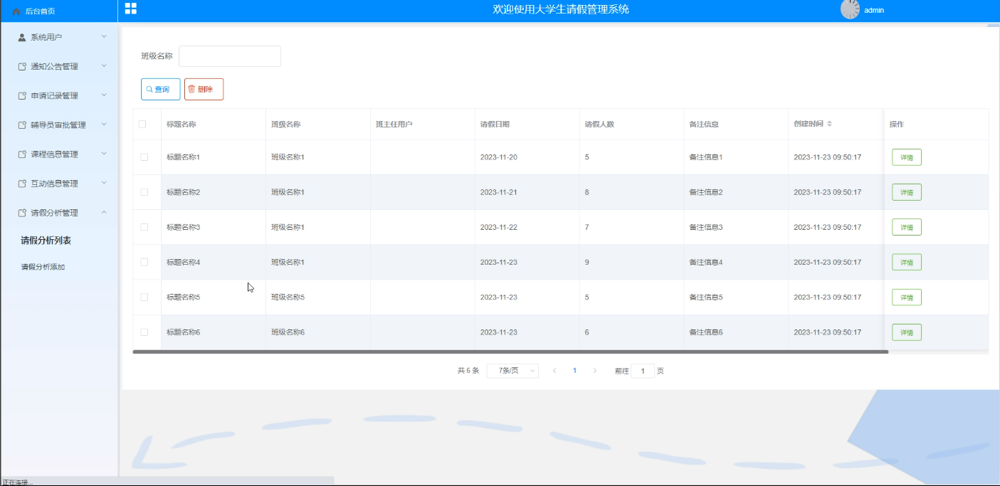 - 请假分析管理:可以查看到学生用户提交的请假分析,可通过web端直接为其查询、添加、删除等操作;