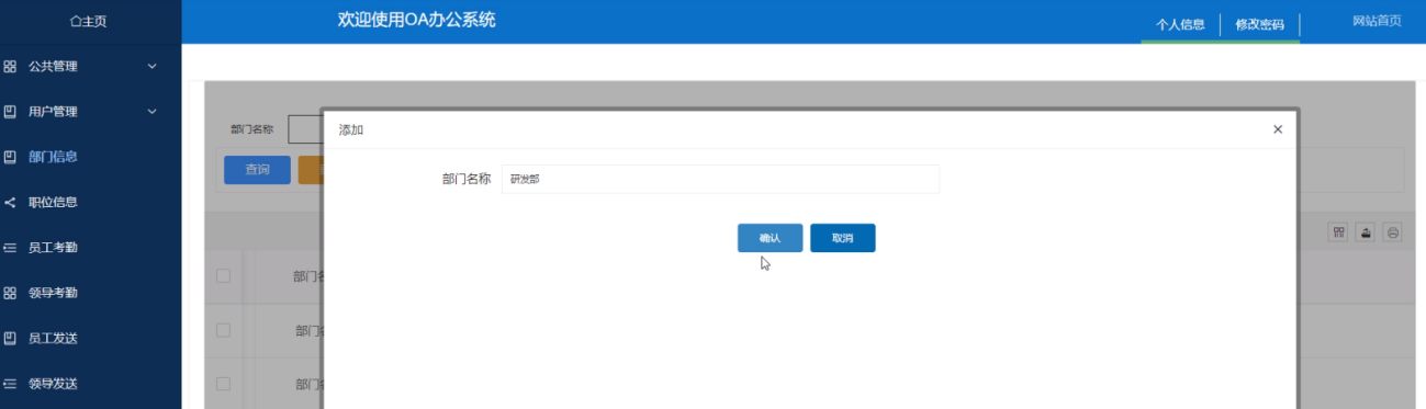 | 添加部门信息模块 | 部门信息页面点击添加按钮,输入:研发部,点击确定 | 提示部门添加成功 | 提示部门添加成功 | 通过 |
