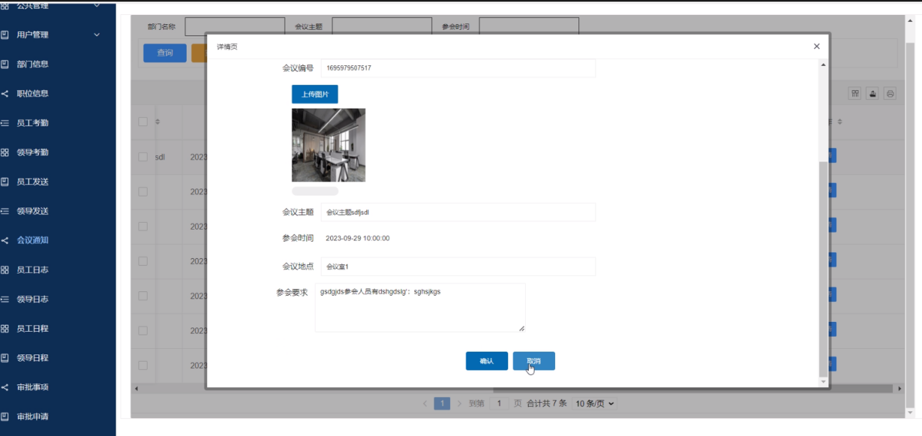 (9)会议通知:主页面展示领导考勤列表,并可以查询、新增、删除、修改会议通知信息,新增会议通知后会在前台会议通知展示该通知信息,点击“详情”可查看该会议通知详细信息;