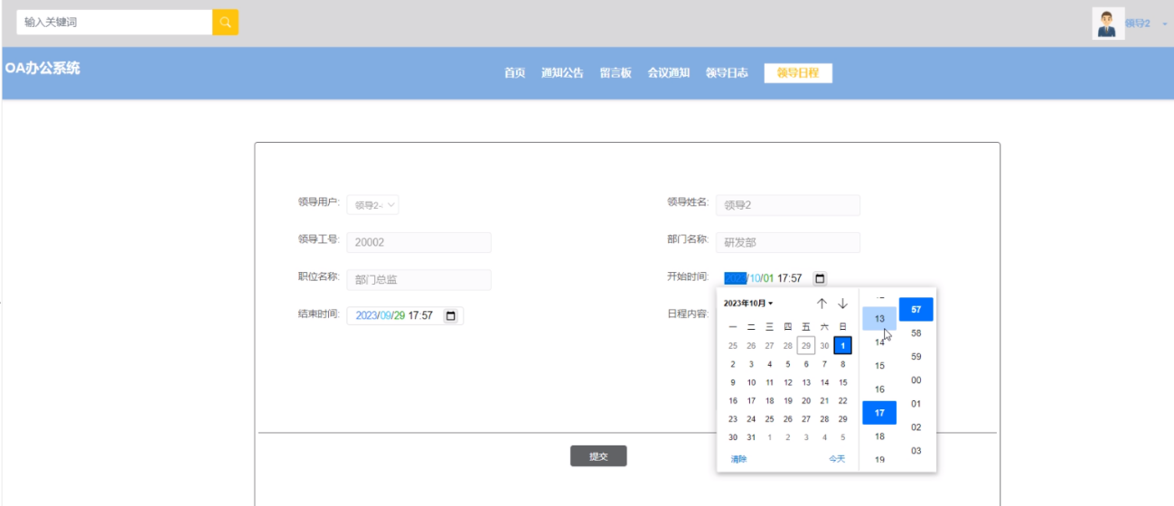 (2)领导日程:领导日程提交页面,输入相关信息提交日程;