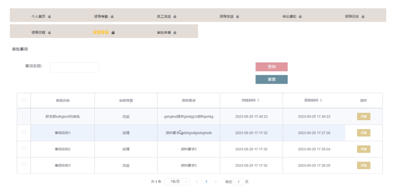 (12)审批事项:主页面展示审批事项列表,并可以查询、新增、删除、修改员工审批事项,点击“详情”可查看该审批事项详细信息;