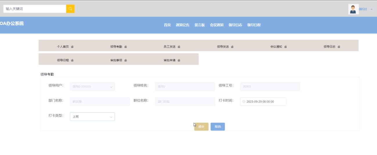 注册登录、首页、通知公告、留言板、会议通知、我的账户跟员工用户一样,以下主要介绍领导用户其他功能: