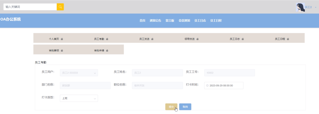 个人中心包含:个人首页、员工考勤、员工发送、领导发送,员工日志,员工日程,审批事项,申请申请等功能模块,以下主要展示几个功能页面:员工考勤提交页面,如图5-8所示: