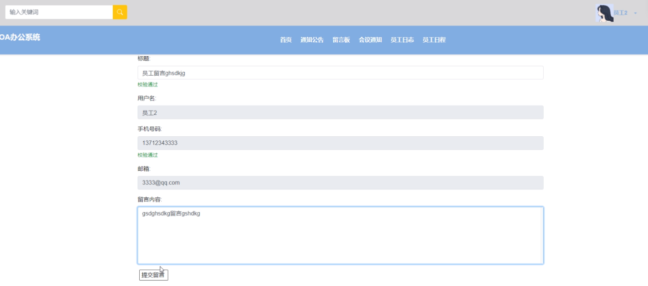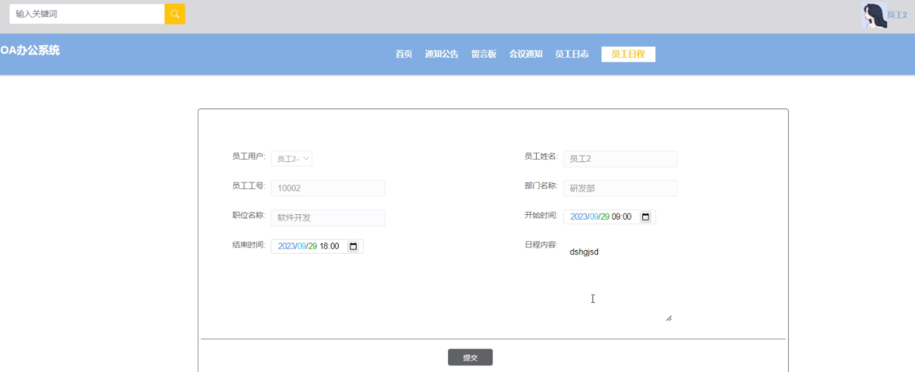 展示员工日程界面,输入相关信息后点击“提交”按钮提交员工日程,,如图5-7所示。