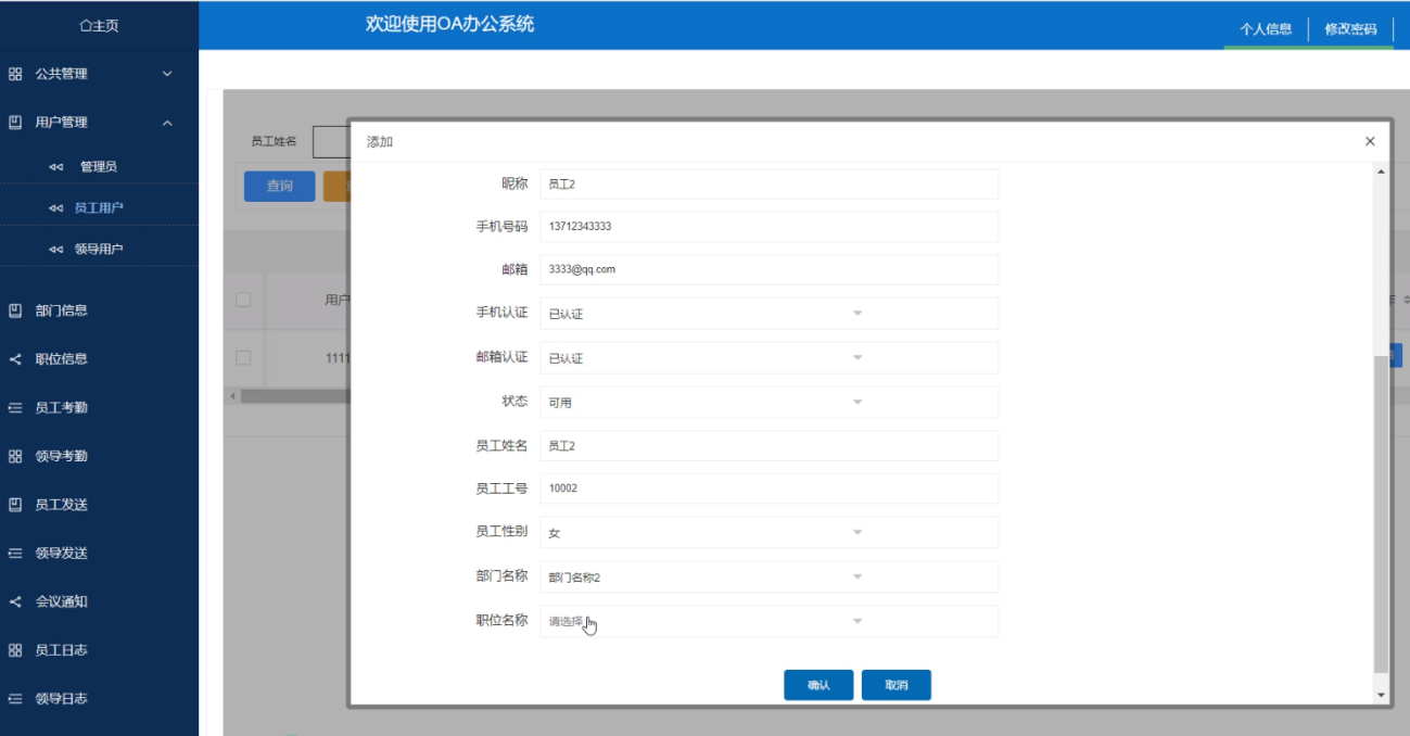 (2)用户管理:管理员管控所有角色用户,包含了管理员、员工用户、领导用户,可进行查询、新增、删除、修改操作以及管理用户状态等;