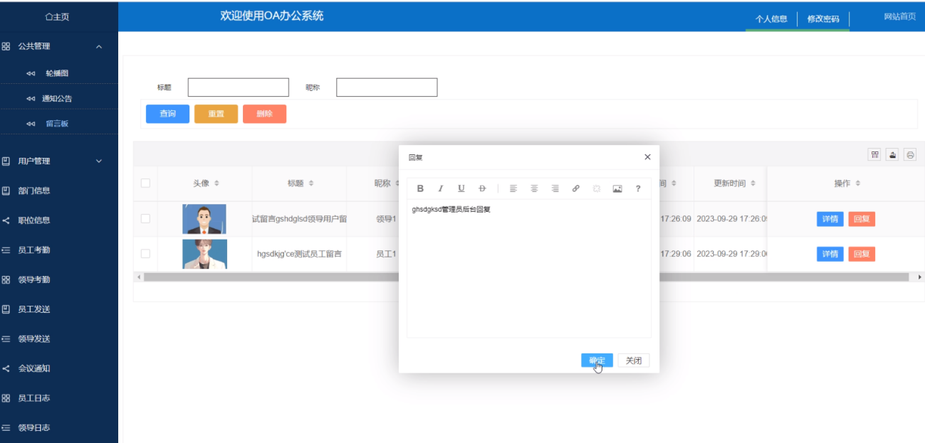 (1)公共管理:包含对轮播图、通知公告、留言板功能查询、添加、修改、删除操作,在留言板模块,还能回复前台的留言信息。