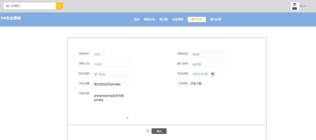 (1)领导日志:领导日志提交页面,输入相关信息提交日志;