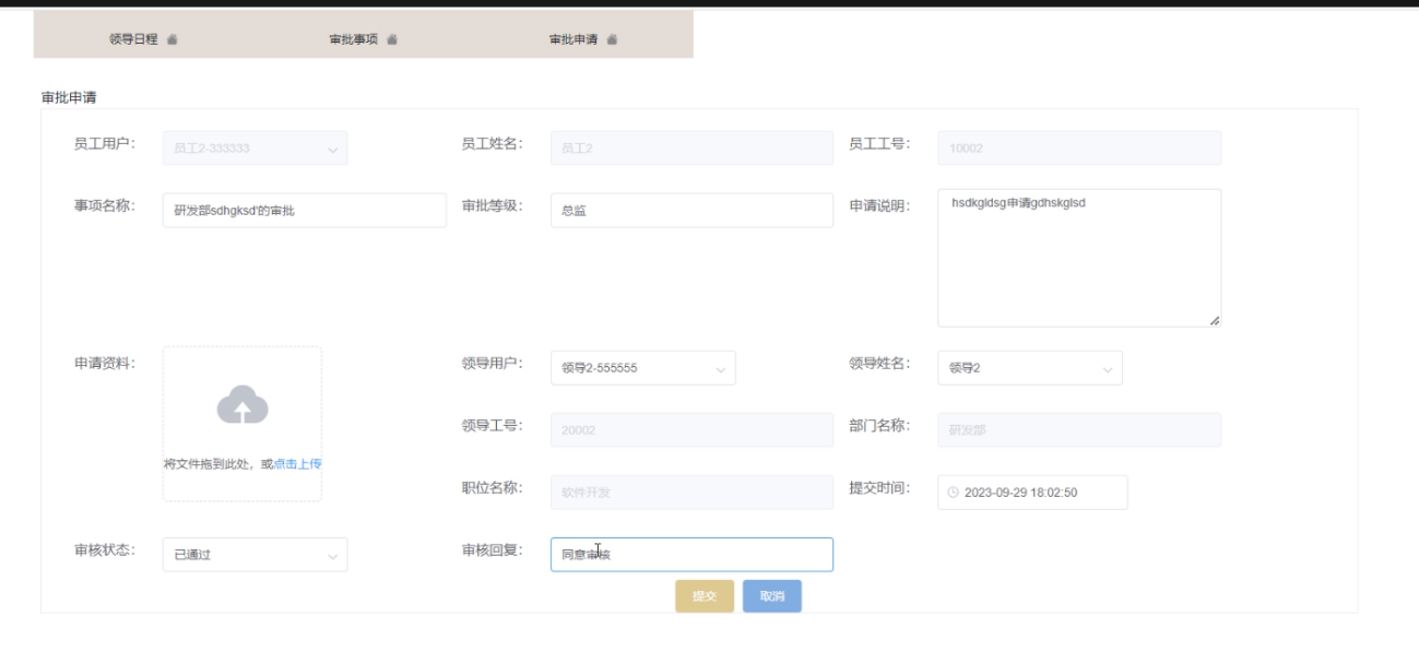 审批事项与审批申请:审批模块允许员工在线提交各类审批申请,领导可以在线审批,大大提高了审批效率。