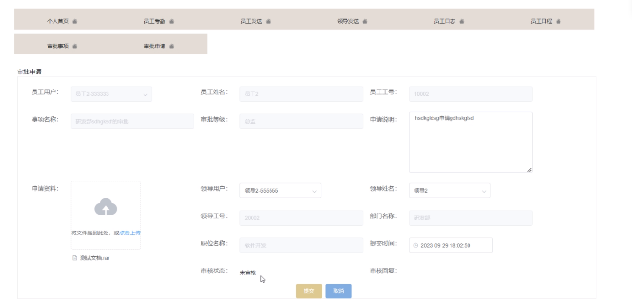 (8)个人中心包含:个人首页、员工考勤、员工发送、领导发送,员工日志,员工日程,审批事项,申请申请等功能模块