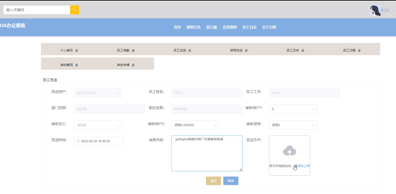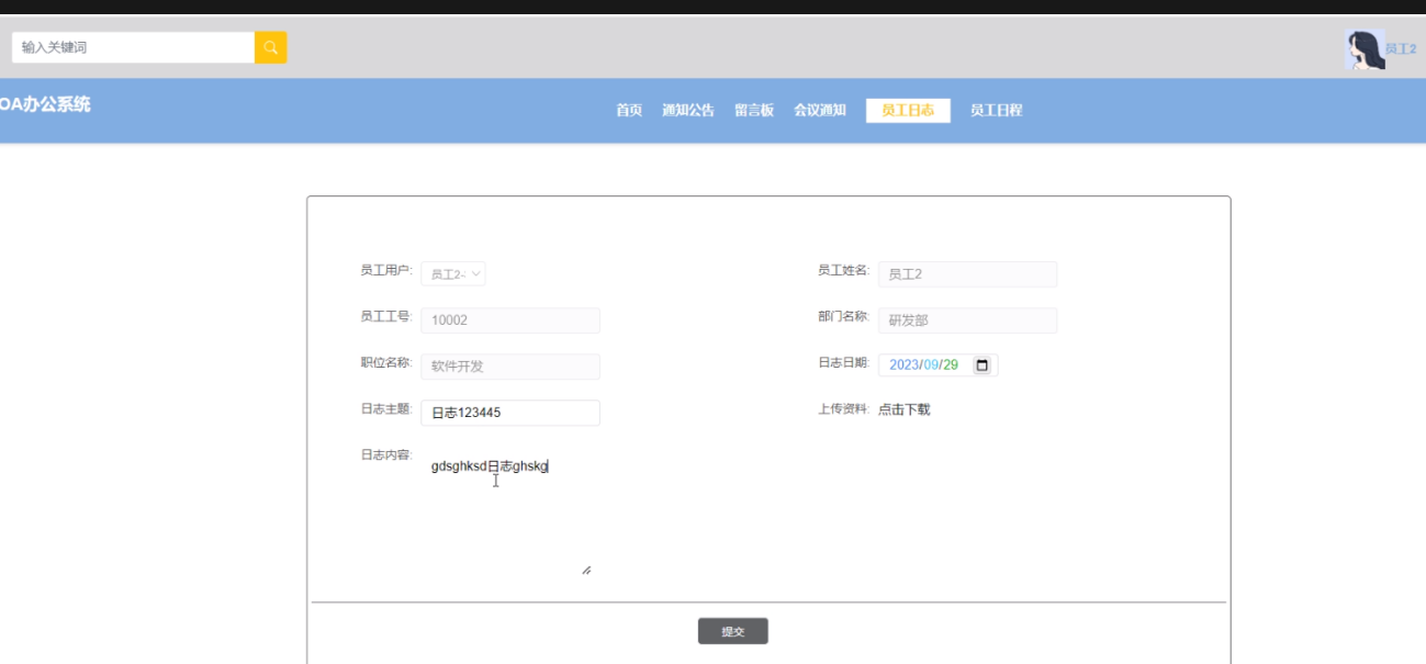(5)员工日志:员工日志提交页面,输入相关信息提交日志;