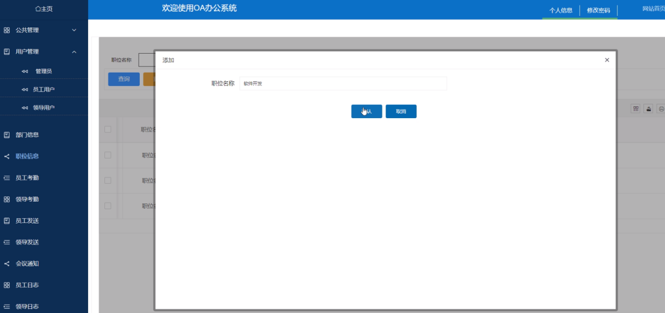 (4)职位信息:主页面展示职位列表,并可以查询、新增、删除、修改职位信息,点击“详情”可查看对应职位详细信息;