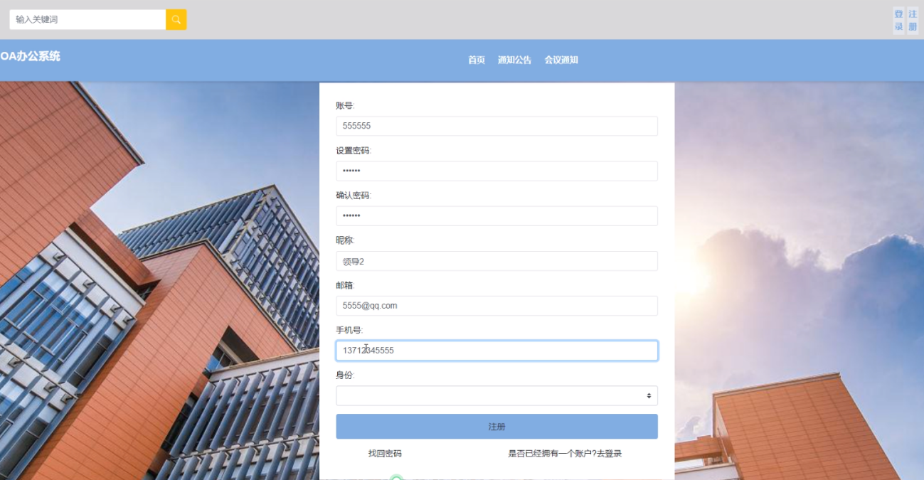 用户注册:页面中输入:账号、设置密码、确认密码、昵称、邮箱、手机号、身份等信息,点击注册,如图5-2所示。