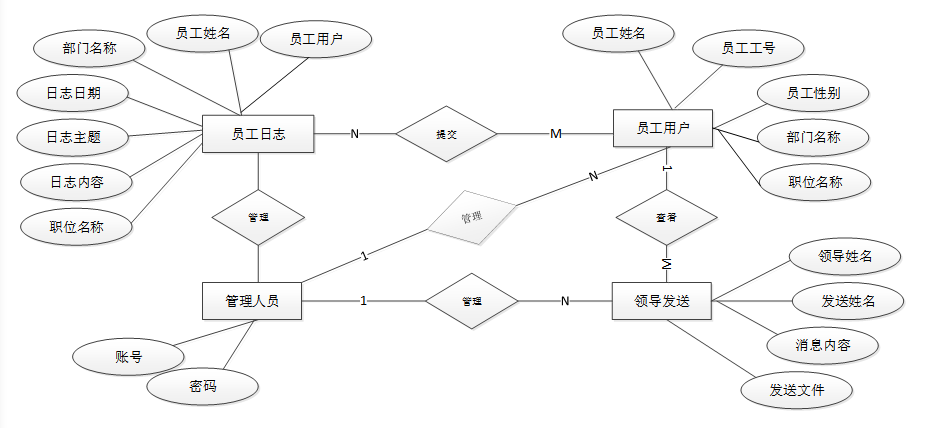 OA办公系统中管理员、员工用户、员工日志、领导发送E-R实体关系图。