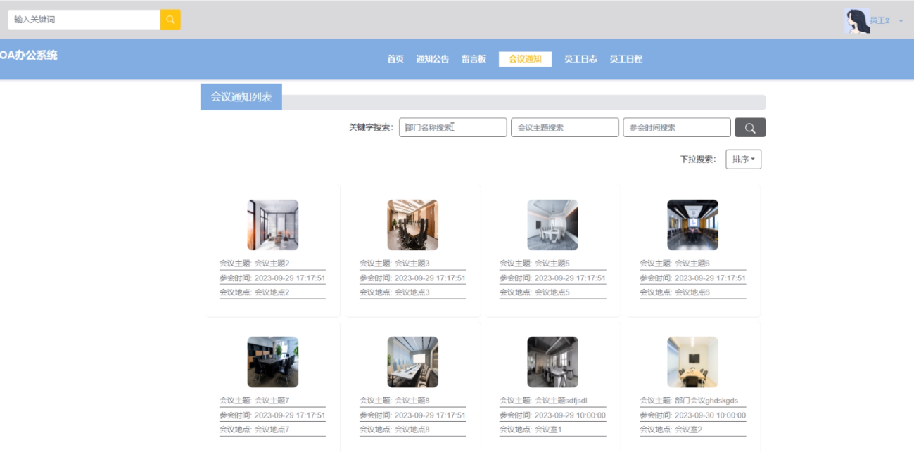 (4)会议通知:展示会议通知列表,可通过关键字跟下拉搜索进行搜索,点击会议可查看详细会议内容;
