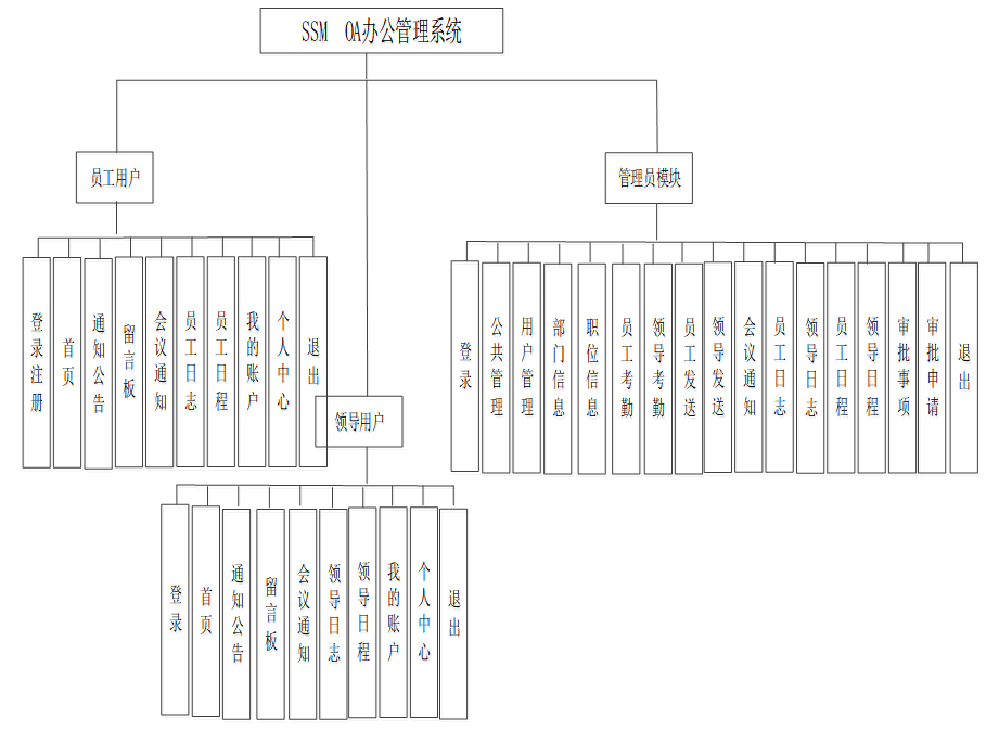 OA办公系统功能模块有员工用户、领导用户、管理员三个角色,每个角色对应的功能模块如图4.1所示。