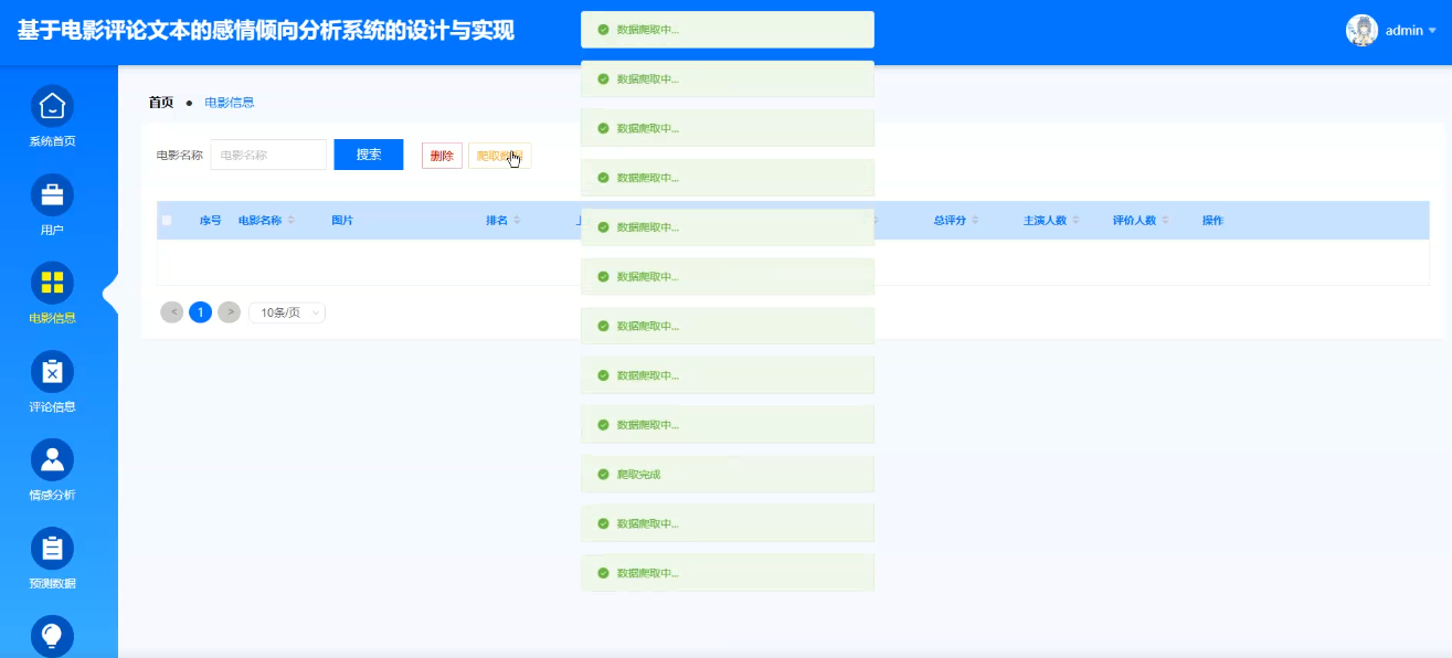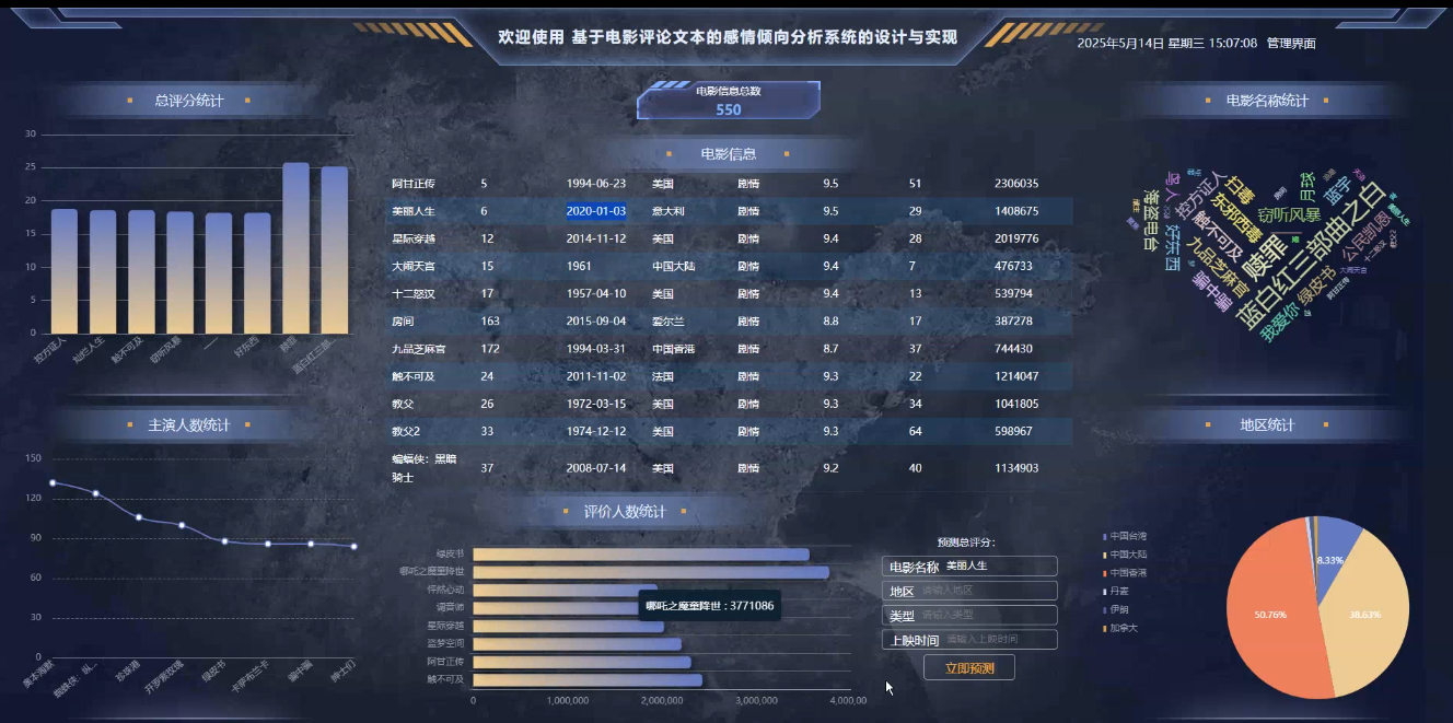 This system uses Vue to build the front-end, Django to build the back-end, MySQL as the database, and web crawling technology for data collection. Users can view movie information, post comments, view sentiment analysis, and manage personal information. Administrators are responsible for user management, movie information management, comment management, sentiment analysis, predictive data, and system management. The system provides a visual large screen that displays statistics on total ratings, number of lead actors, total number of movies, number of reviewers, movie titles, regions, and total rating predictions. The system provides efficient information management and data analysis tools for the film and television industry, helping audiences quickly obtain movie information and enhance their viewing experience. At the same time, it provides precise data support for film and television producers and operators, helps optimize works, precision marketing, and promotes the digital transformation of the film and television industry.