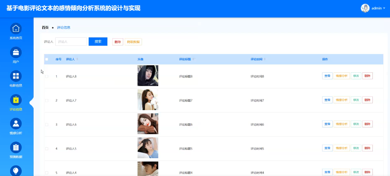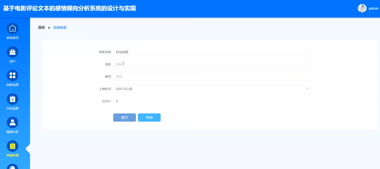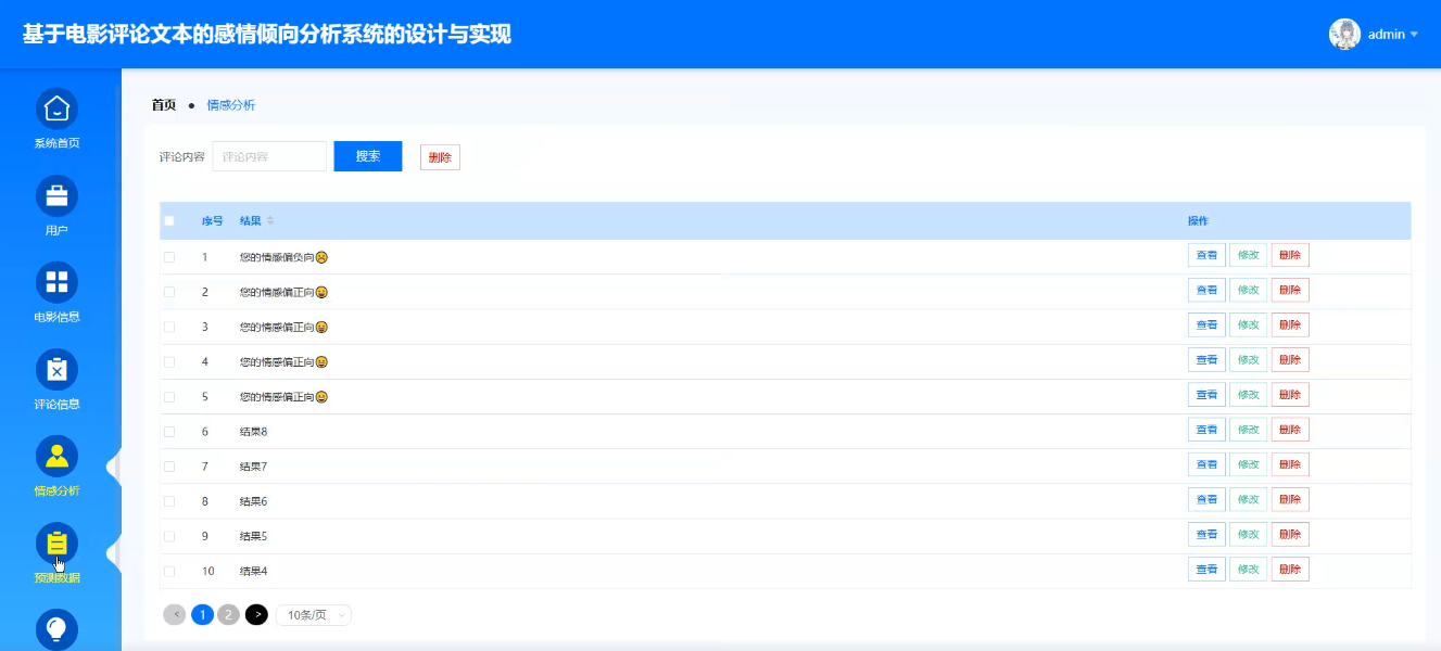 管理员可以在情感分析页面对电影评论进行情感倾向分析,系统会生成情感分析报告。管理员可以查看分析结果,并根据需要进行调整。情感分析界面如图5-8所示。