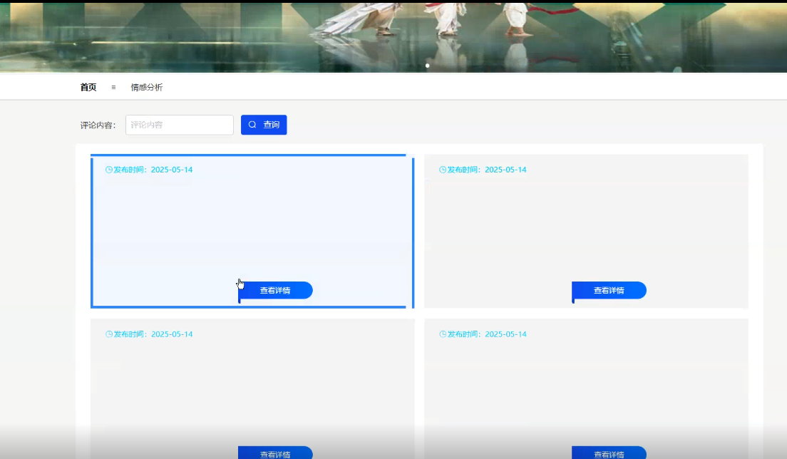 | 情感分析查看功能测试 | 1. 登录系统2. 导航至情感分析页面3. 查看情感分析结果 | 系统正常登录页面正确导航分析结果正确显示 | 与预期结果一致 |