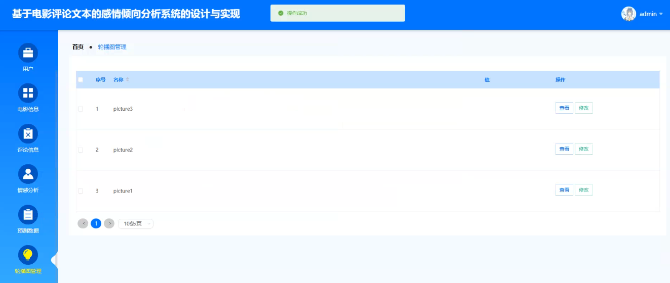 管理员可以在轮播图管理页面对系统轮放的图片,包括增加,修改和删除轮播图等操作。轮播图管理界面如图5-10所示。