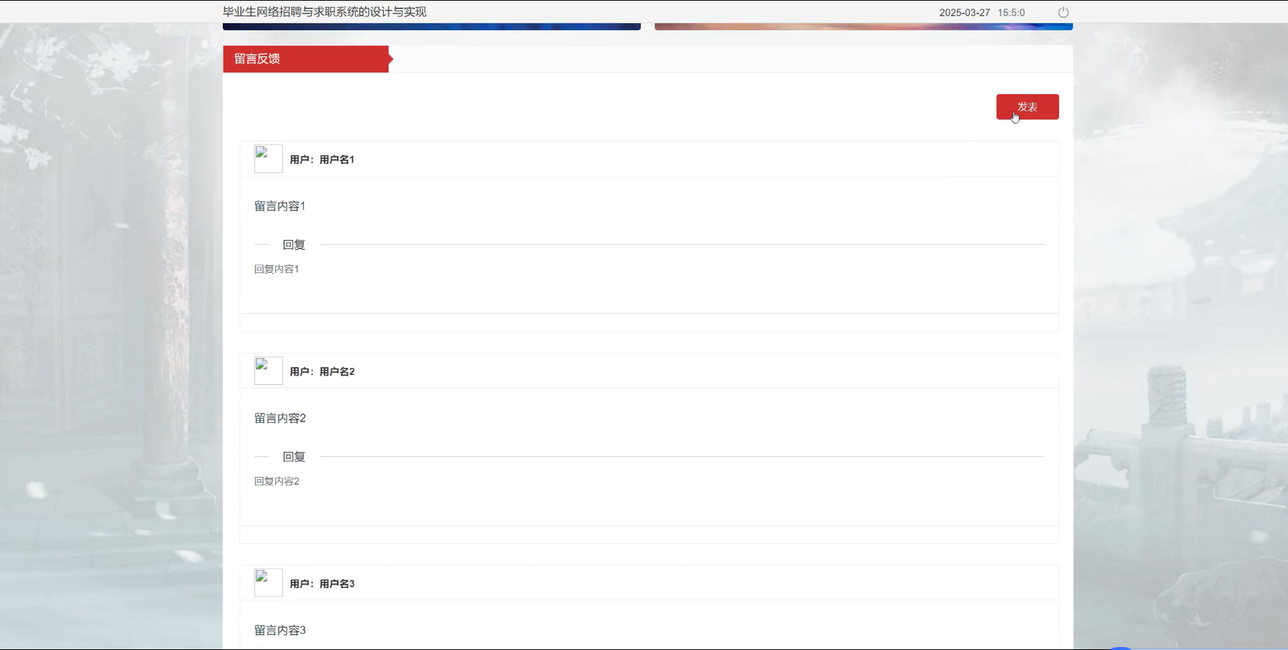 | 招聘信息信息测试 | 登录系统 进入招聘信息管理页面 使用搜索栏输入关键词搜索招聘信息管理 | 无 | 符合预期 |