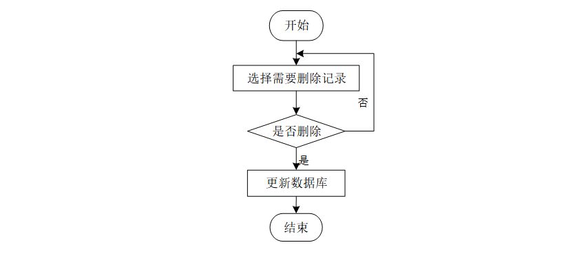 用户选择需要删除的记录后,系统判断是否确认删除。若未确认,返回选择环节;若确认删除,则更新数据库,删除对应记录,完成操作后流程结束。删除信息流程图如图3-9所示。