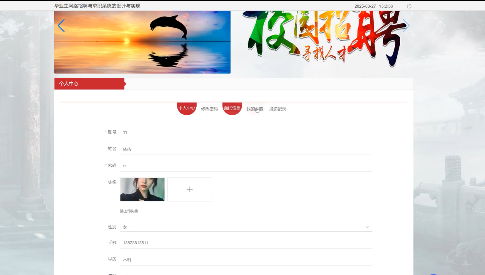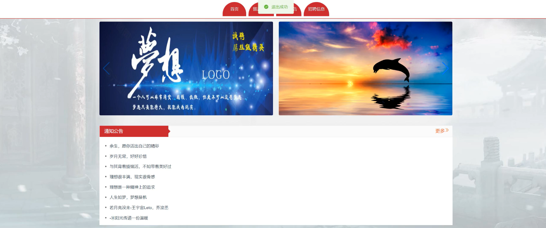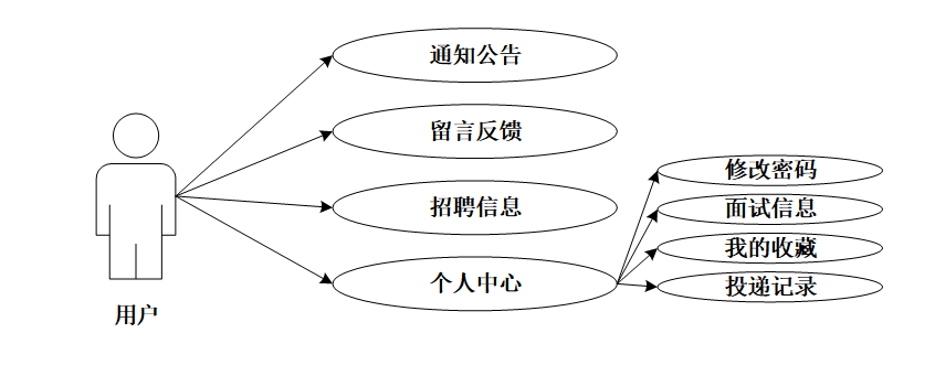 用户可以浏览留言反馈、通知公告、招聘信息、个人中心(修改密码、面试信息、我的收藏、投递记录)等。