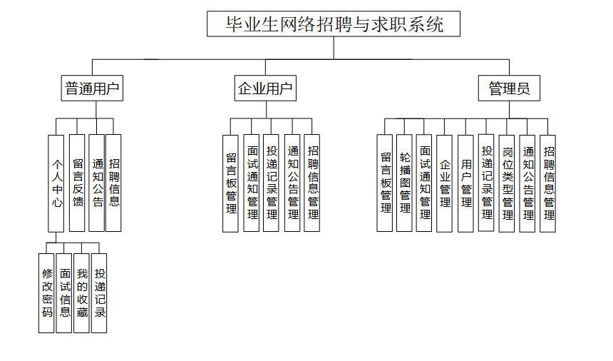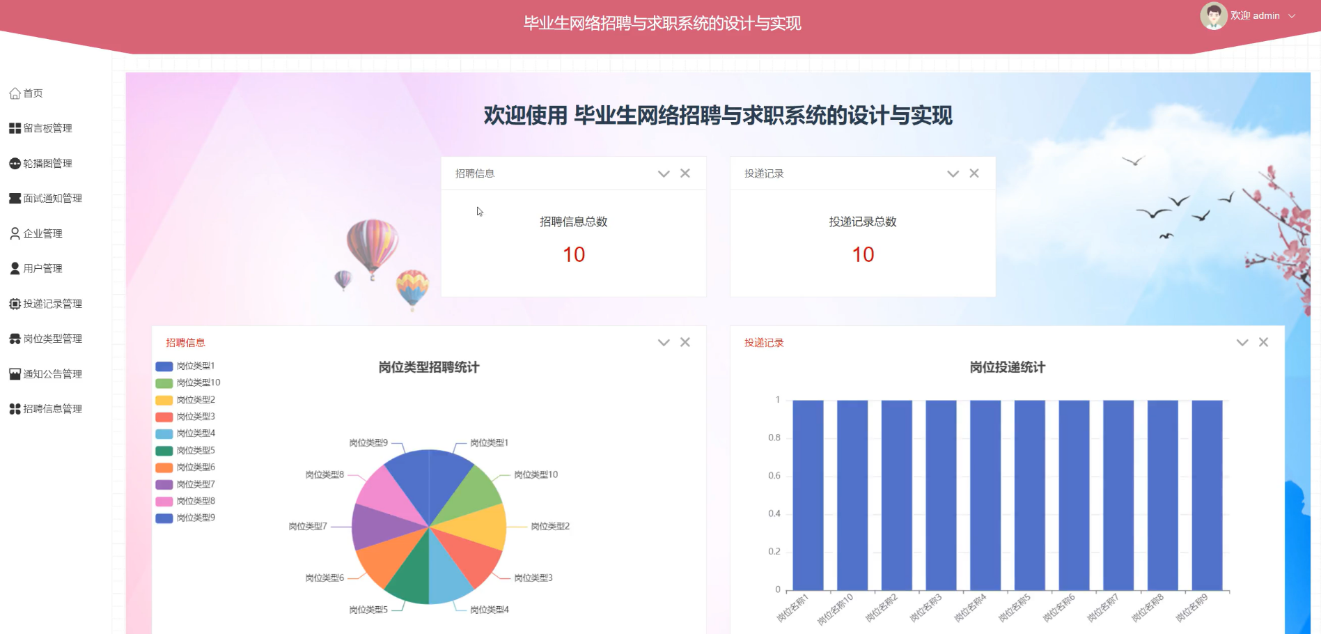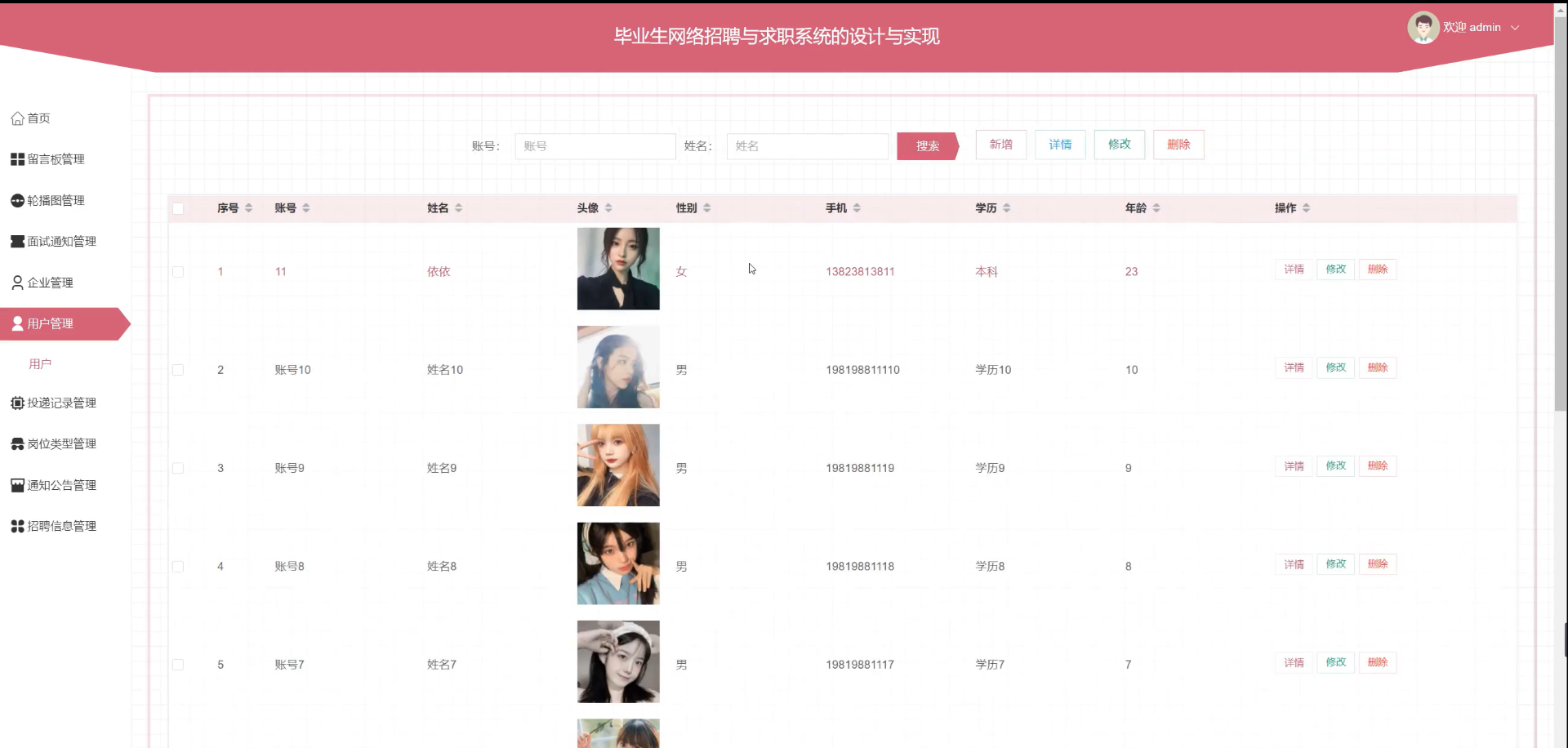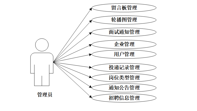 管理员负责平台的留言板管理、轮播图管理、面试通知管理、企业管理、用户管理、投递记录管理 、岗位类型管理、通知公告管理、招聘信息管理等。