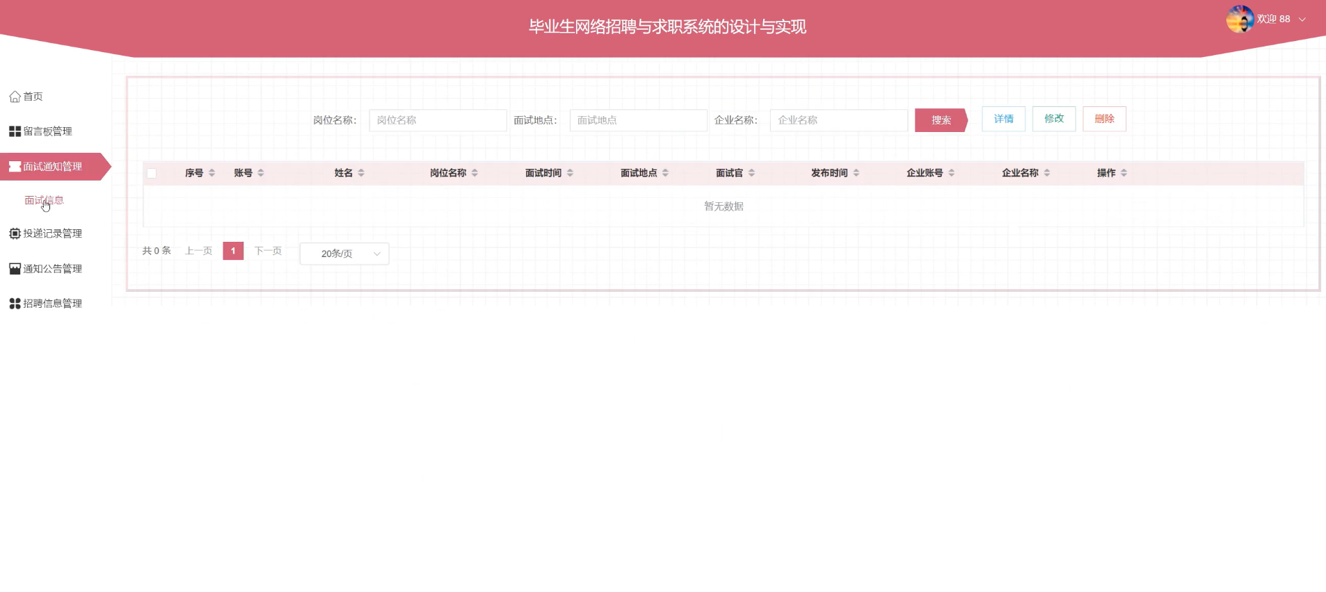企业可以发布面试通知,管理员可以审核并确保信息的准确性,方便求职者和企业之间的沟通。面试通知管理界面如图5-8所示。