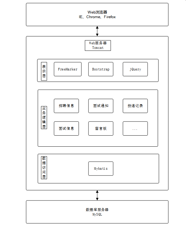 系统由表现层、业务逻辑层、数据访问层和数据库服务器组成。表现层通过浏览器(如IE、Chrome、Firefox)与用户交互,采用FreeMarker、Bootstrap、jQuery等技术实现界面呈现。业务逻辑层负责处理系统的核心业务逻辑,通过分模块设计实现功能分离。数据访问层使用MyBatis框架连接数据库,执行数据的增删改查操作。数据库服务器采用MySQL进行数据存储和管理,为系统提供稳定的数据库支持。整个架构通过Tomcat服务器完成用户请求的接收和处理,确保系统的高效运行[8]。整个系统架构如图4-1所示。