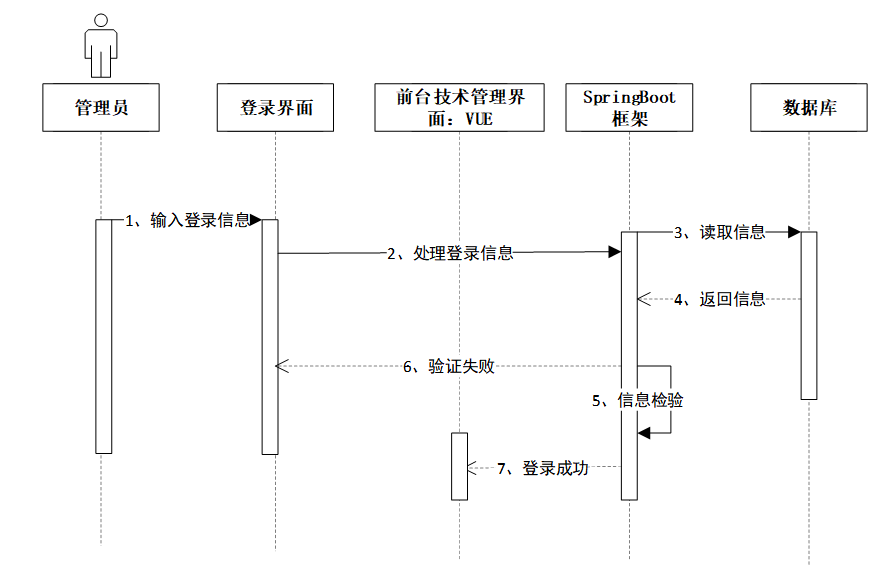 管理员输入登录信息后,登录界面将信息传递至前台管理界面,随后通过SpringBoot框架读取数据库中的用户信息并返回。系统验证信息,若验证成功则登录成功,若验证失败则返回错误提示。登录时序图如图4-4所示。