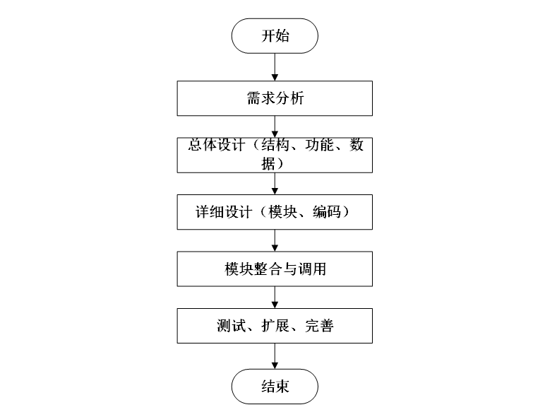 系统开发流程的主要步骤,从需求分析到系统完成的全过程。流程包括需求分析、总体设计(结构、功能、数据)、详细设计(模块、编码)、模块整合与调用,以及测试、扩展和完善,最终完成系统的开发。本系统的开发流程如图3-4所示