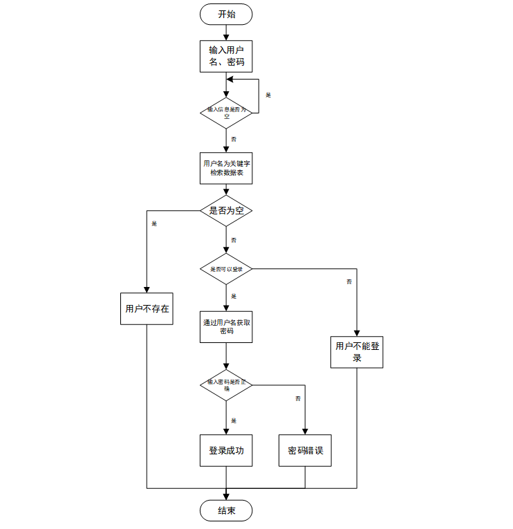 用户输入用户名和密码后,系统先检查输入是否为空,再验证用户名是否存在,若存在则通过用户名获取密码并校验。若密码正确则登录成功,否则提示密码错误。若用户名不存在或无法登录,提示用户操作无效。如图3-5所示。