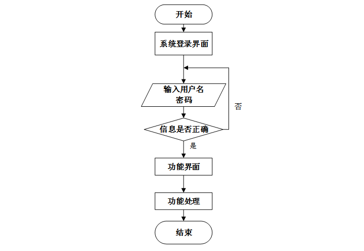 用户首先进入系统登录界面,输入用户名和密码后,系统验证信息是否正确。若验证失败,返回登录界面重新输入;若验证成功,则进入功能界面,执行相应功能处理后结束操作流程。操作流程如图3-6所示。