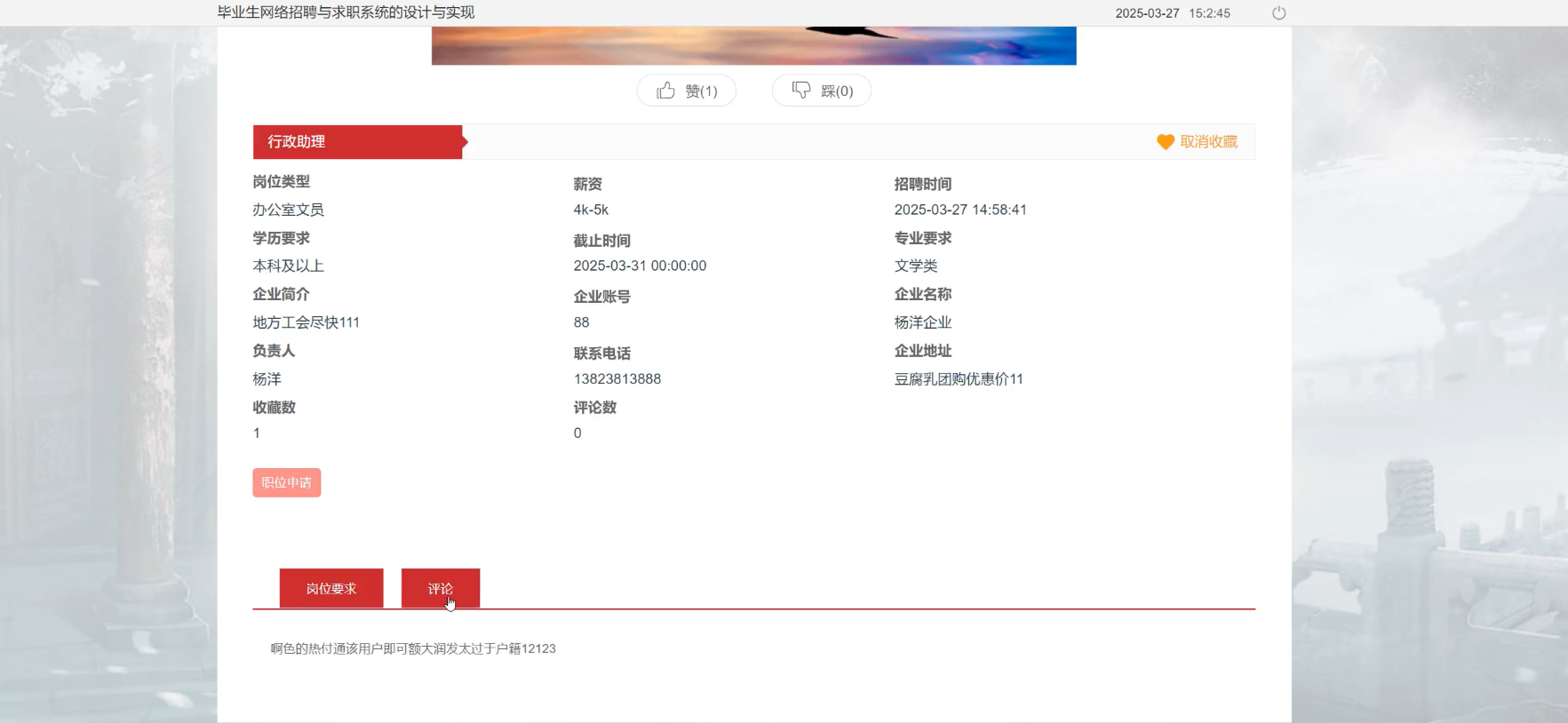| 招聘信息信息测试 | 登录系统 进入招聘信息管理页面 点击招聘详情查看完整信息 | 无 | 符合预期 |