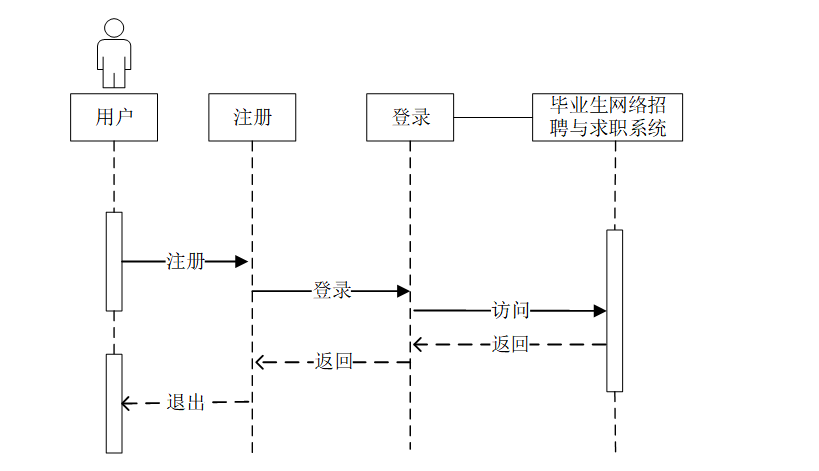 用户通过注册模块发送注册请求,系统完成注册后返回确认信息。随后,用户通过登录模块发送登录请求,系统验证用户信息后允许访问目标系统。用户完成操作后可选择退出,系统终止会话。注册时序图,如图4-3所示。