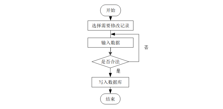 用户首先选择需要修改的记录,输入修改后的数据,系统判断输入数据是否合法。若数据不合法,提示重新输入;若数据合法,则将修改后的数据写入数据库,完成操作后流程结束。修改信息流程图如图3-8所示。