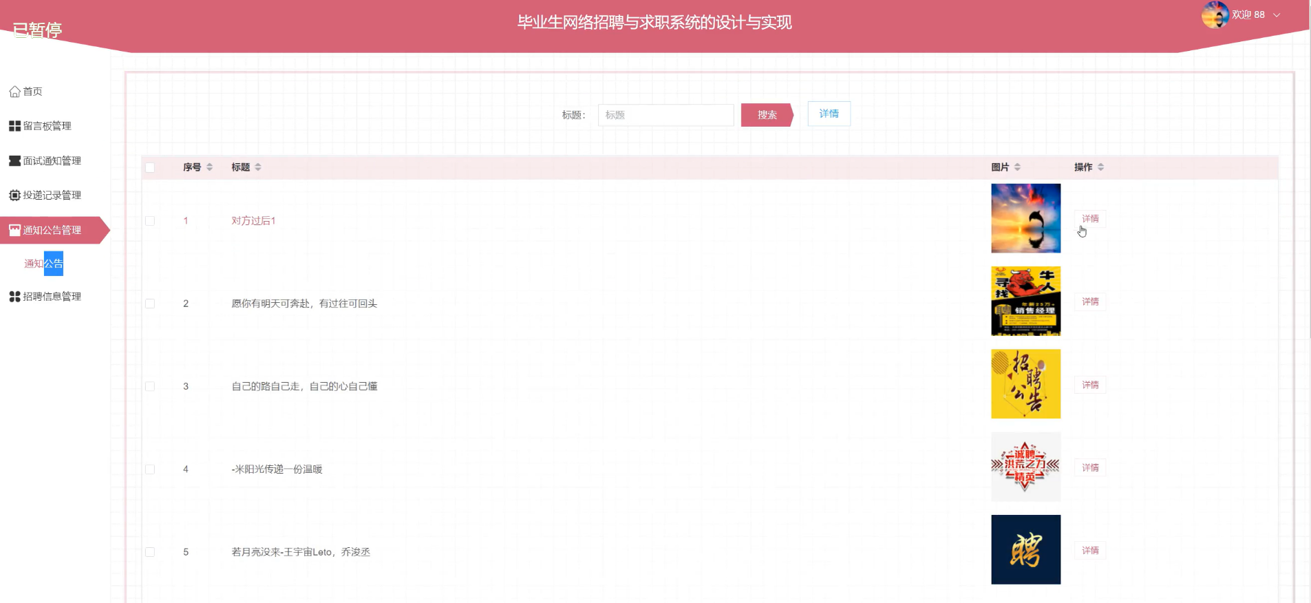 企业和管理员可以发布、修改和管理平台上的通知公告,确保信息及时传达给求职者和企业用户。通知公告管理界面如图5-10所示。