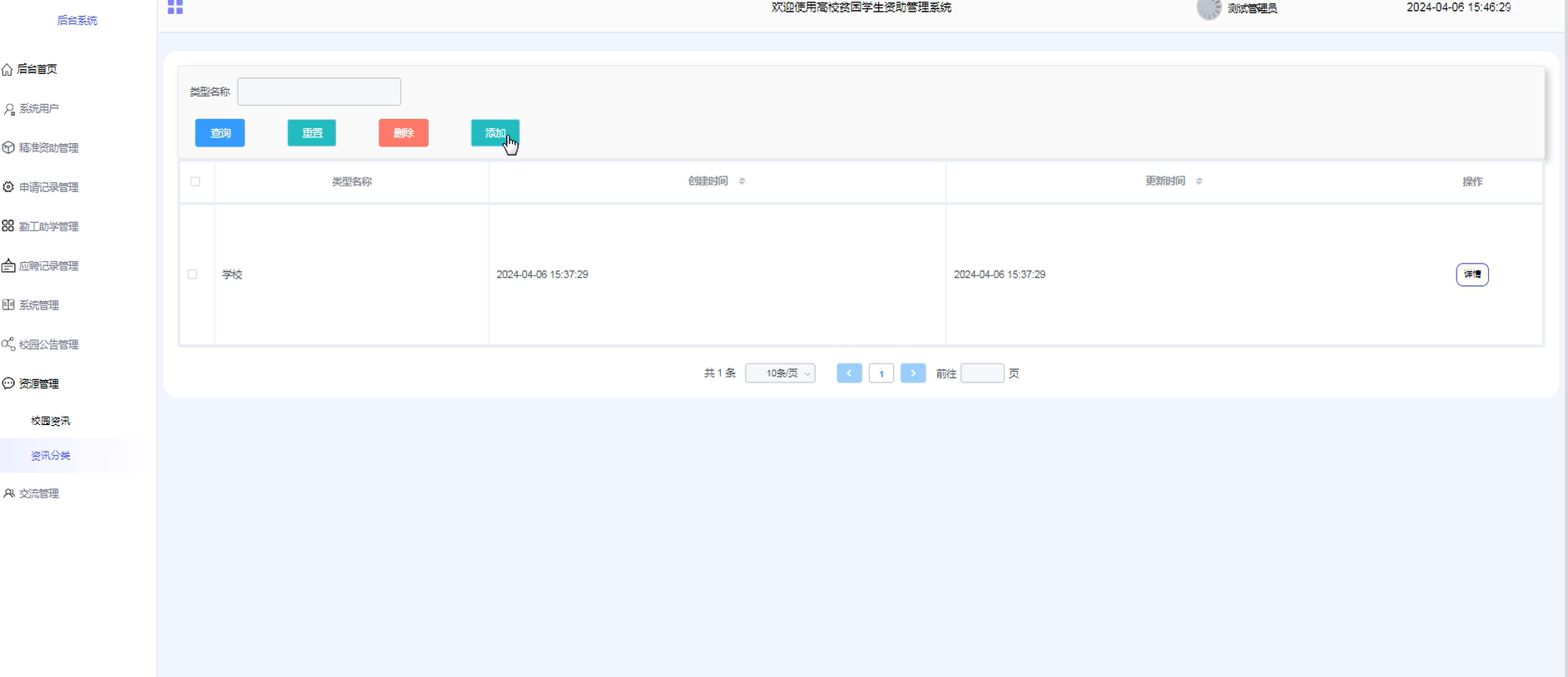 当点击“资源管理”这一菜单的时候,会出现校园资讯、资讯分类这两个子菜单,可以对这两个模块进行增删改查操作。资源管理界面如下图所示。