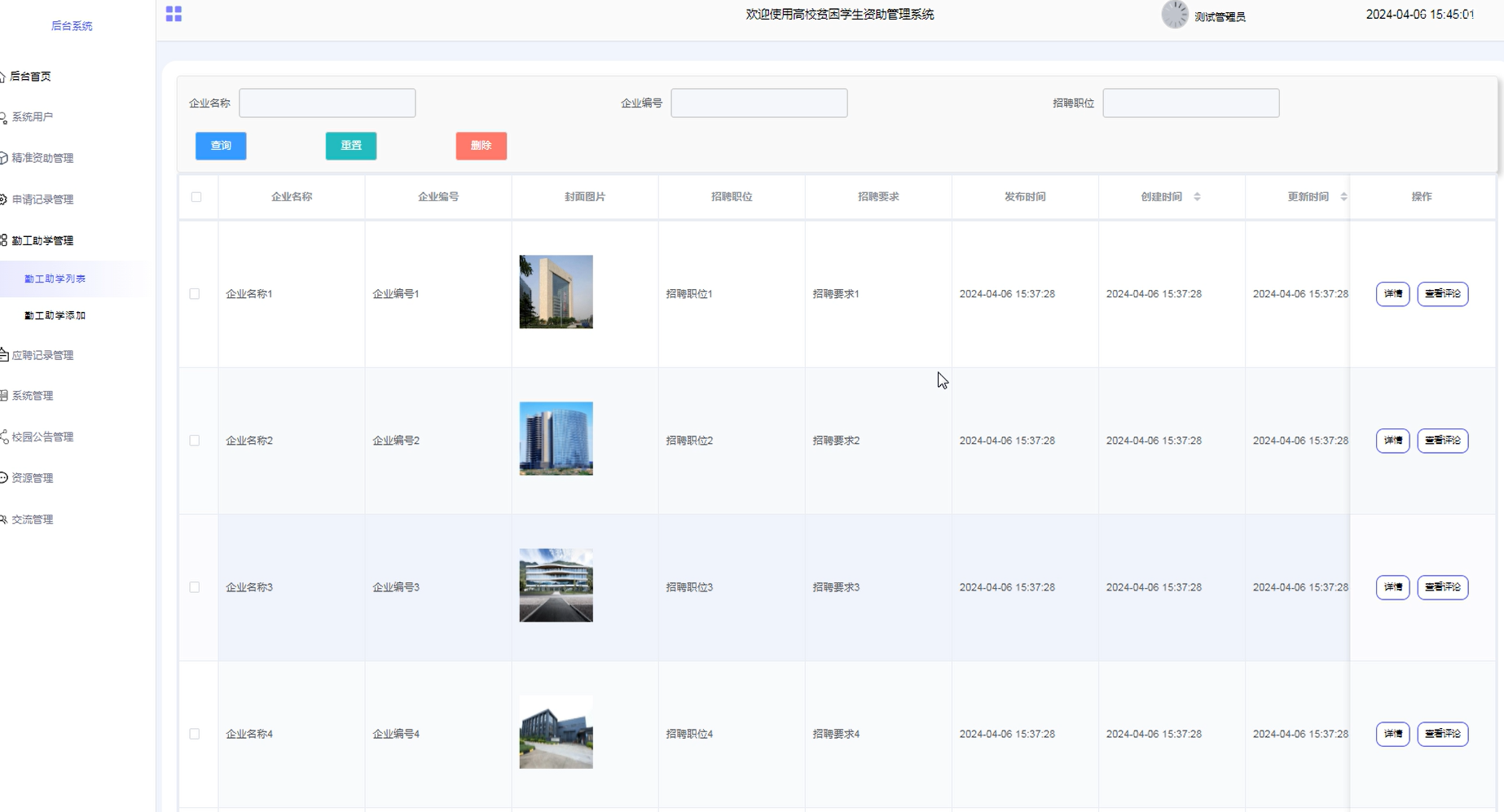 (7)勤工助学管理:这个功能模块用于勤工助学信息管理,包括对勤工助学信息的查询、删除、添加、查看评论和点击详情查看。