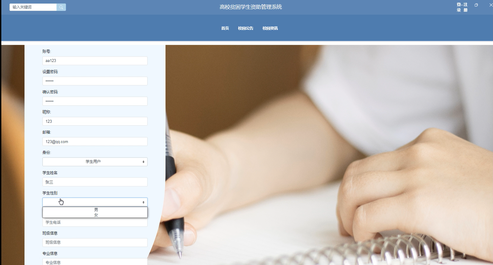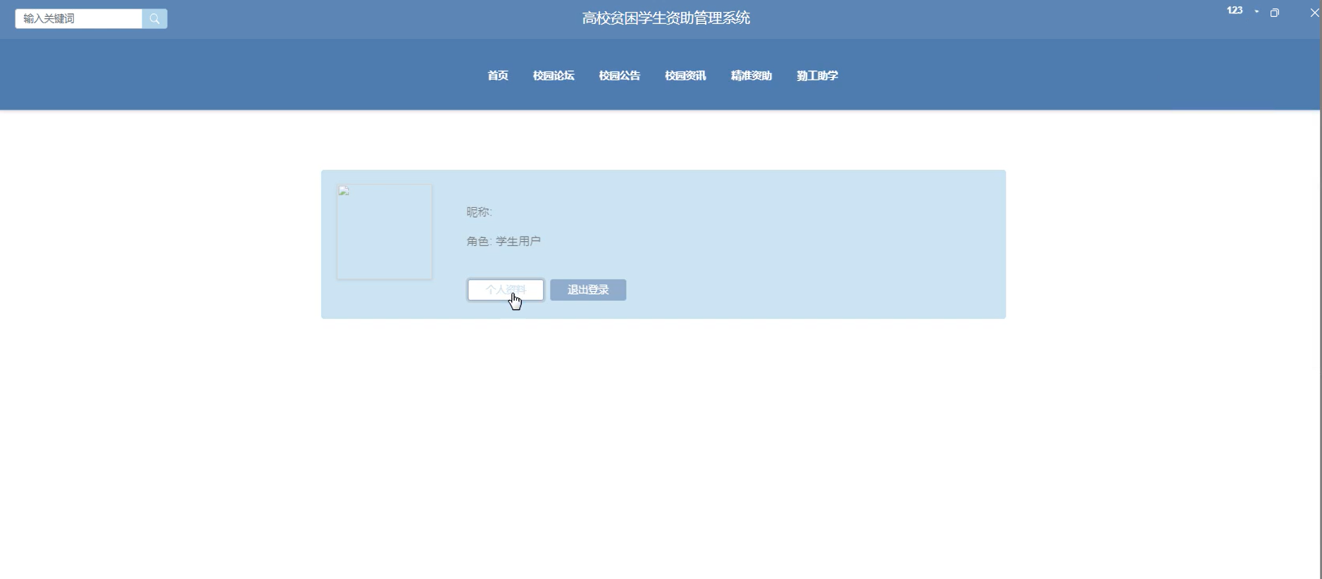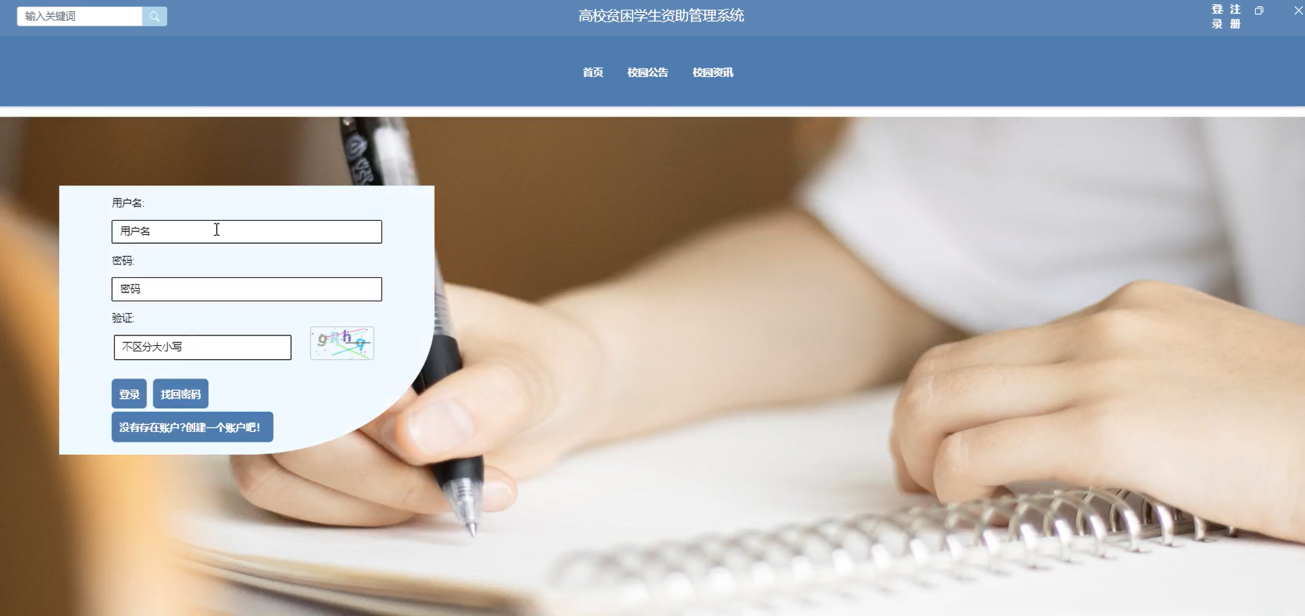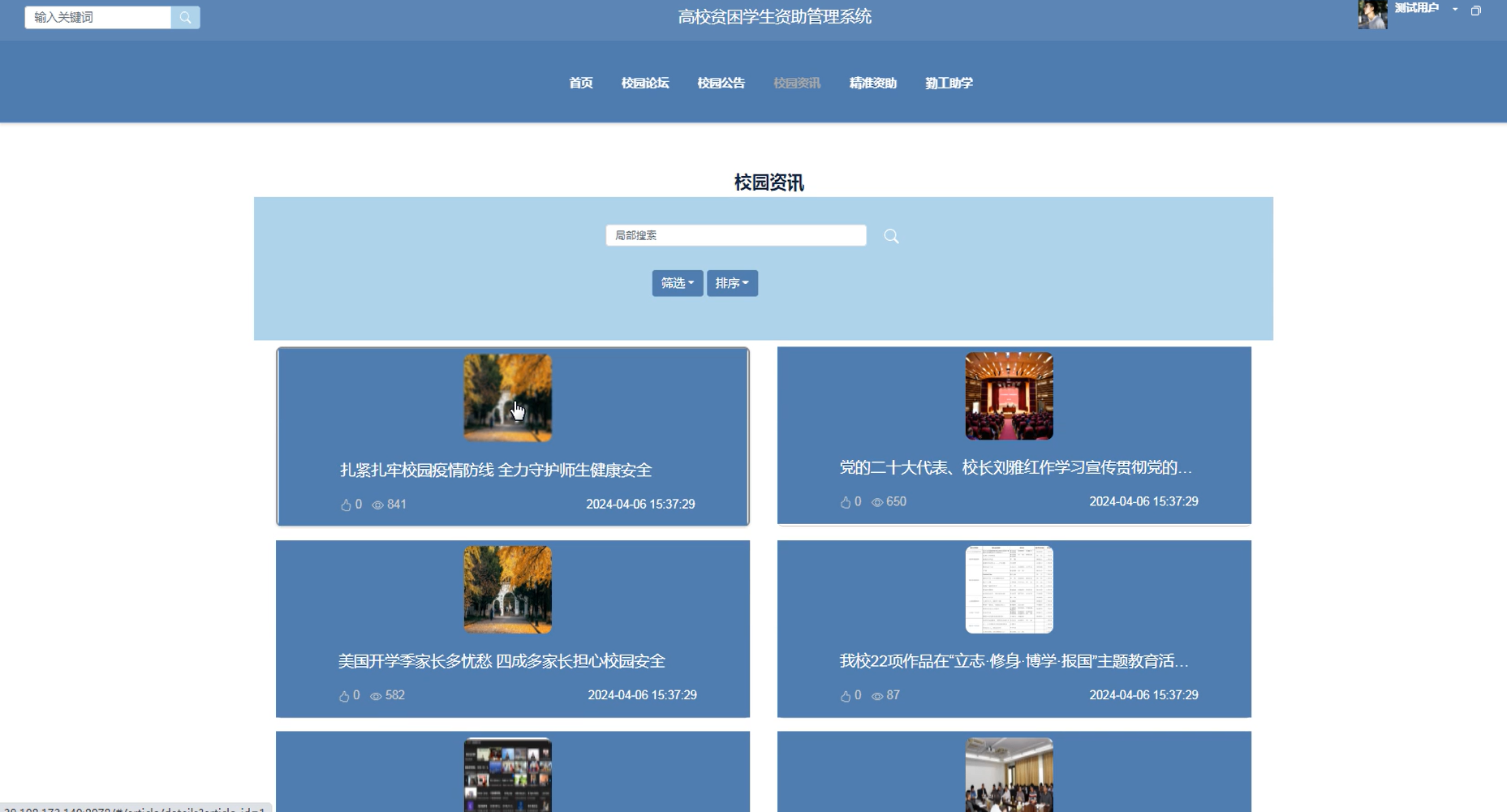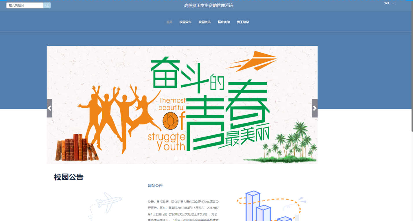 (2)查看高校贫困学生资助管理系统的首页信息:高校贫困学生资助管理系统的首页信息包含了首页、校园公告、校园资讯、精准资助、勤工助学等。