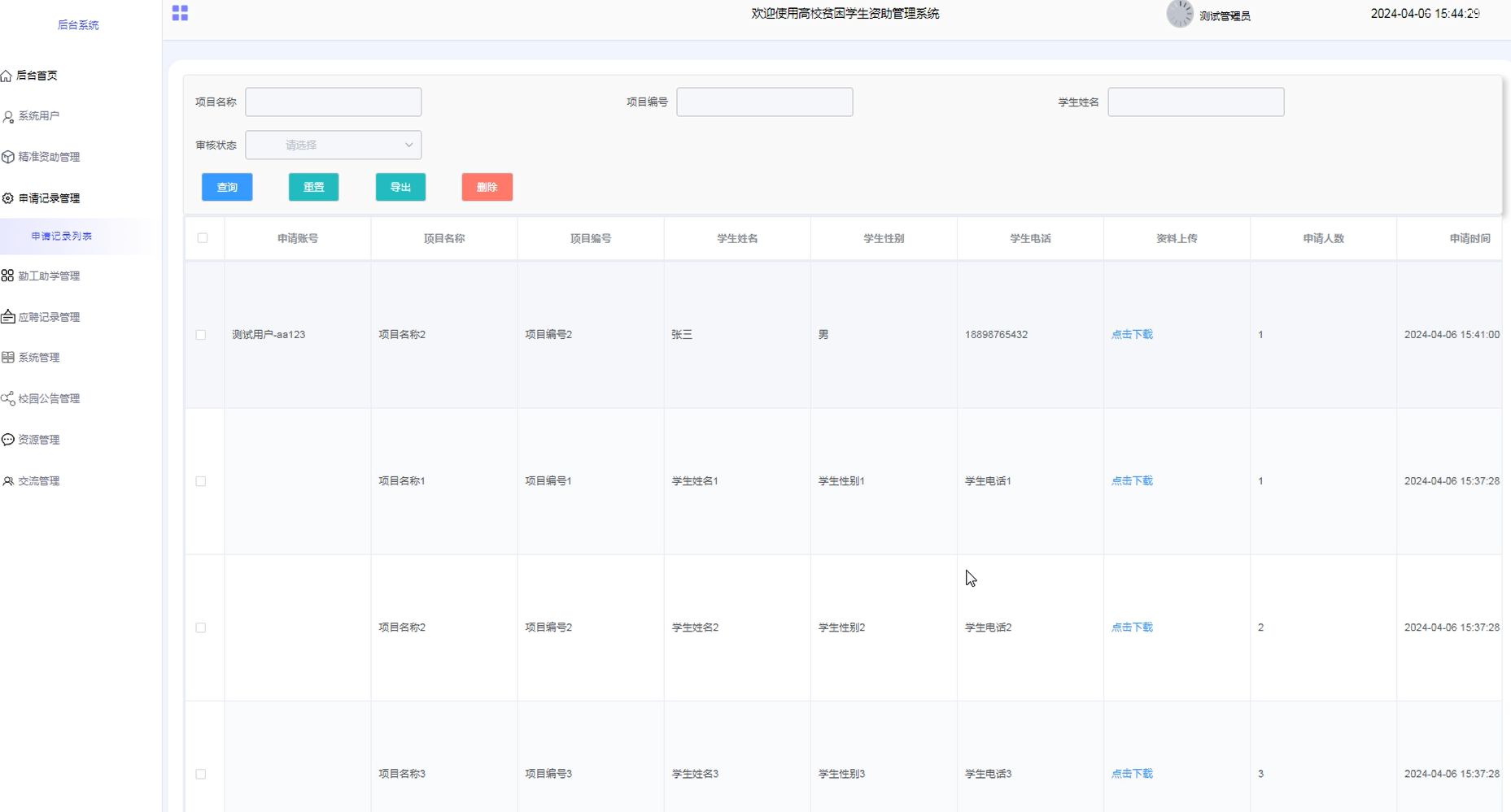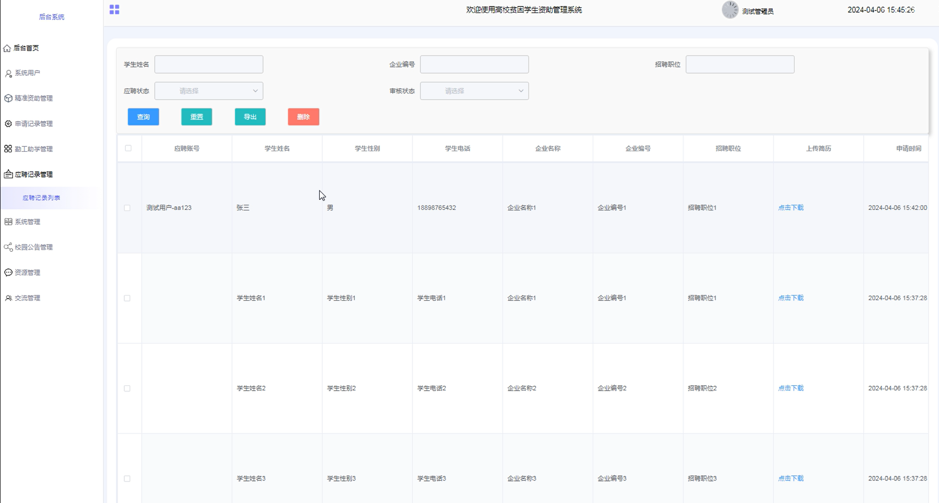 (6)申请记录管理:该功能模块用于管理资助申请记录。包括对资助申请记录的查询、删除、导出数据,点击详情可进行审核应聘状态、审核状态。