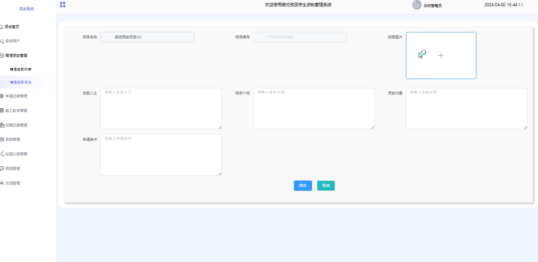 (7)精准资助:显示所有的精准资助列表,学生可以点击某一项目查看详情、收藏、点赞和评论及助学申请(填写申请人数、申请时间、备注详情、上传资料文件然后点击提交等待管理员审核并回复)。