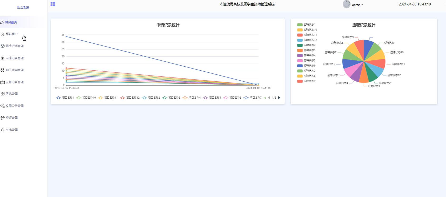 该系统主要包括功能模块有:后台首页(数据统计报表)、系统用户(管理员、学生用户)、精准资助管理(精准资助列表、精准资助添加)、申请记录管理、勤工助学管理(勤工助学列表、勤工助学添加)、应聘记录管理、系统管理(轮播图)、校园公告管理、资源管理(校园资讯、资讯分类)等。通过使用SSM框架,实现了前后端交互、数据持久化和业务逻辑处理,保证了系统的稳定性和可扩展性。