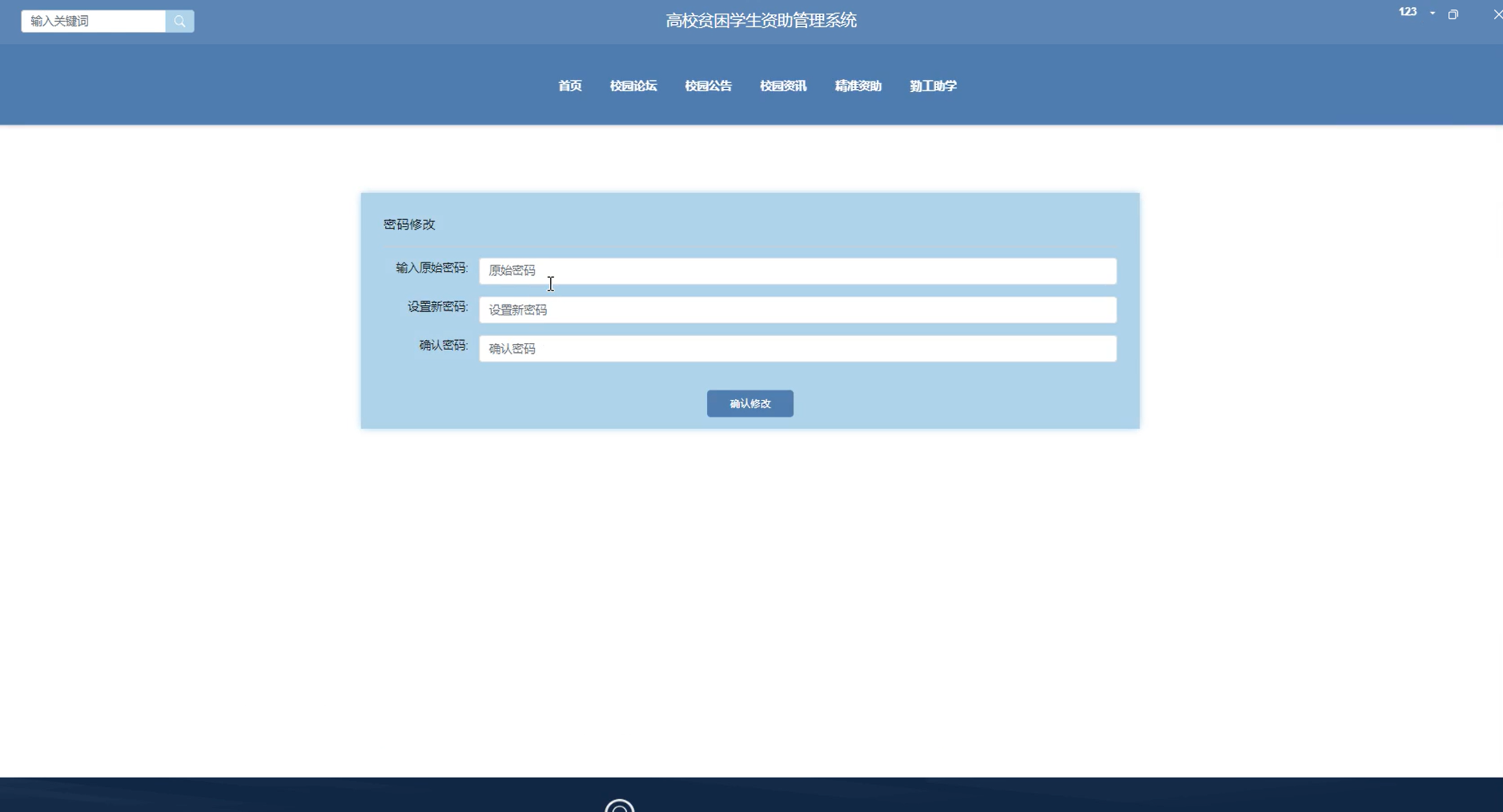 The system mainly includes function modules: background home page (data statistics), system users (administrator, students), accurate funding management (accurate funding list, accurate add), apply for record management, work-study management (work-study list, work-study add), apply for record management, system management (rotation), campus announcement management, resource management (campus information, information classification), etc. By using the SSM framework, the front and rear end interaction, data persistence and business logic processing are realized, which ensures the stability and scalability of the system.