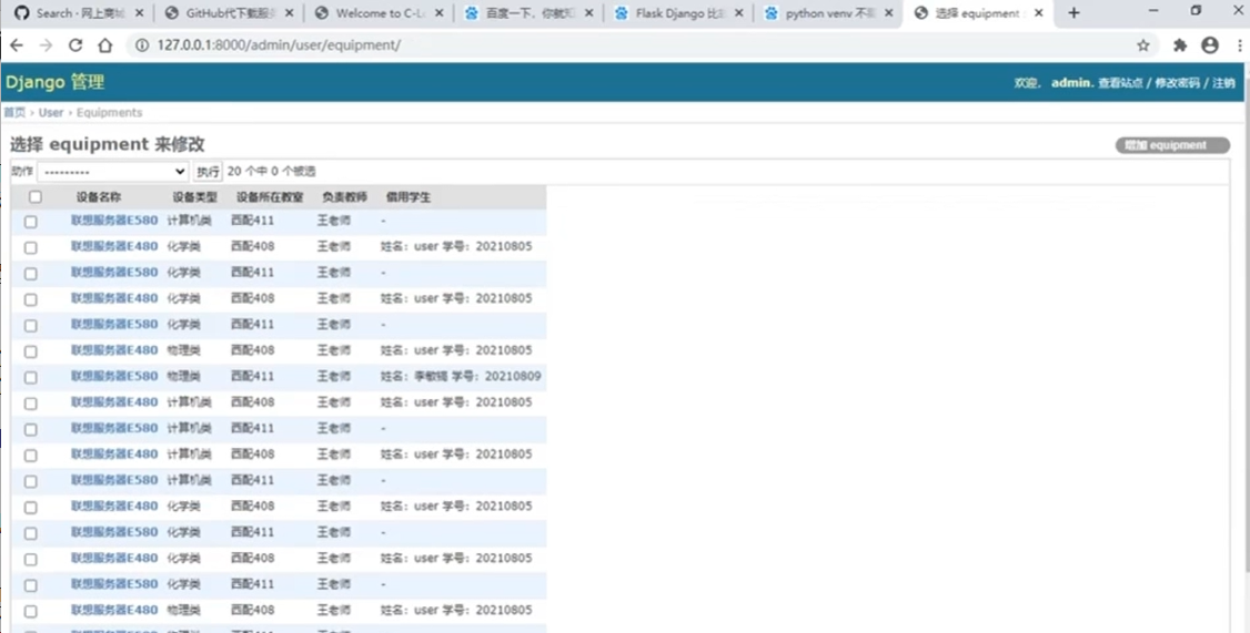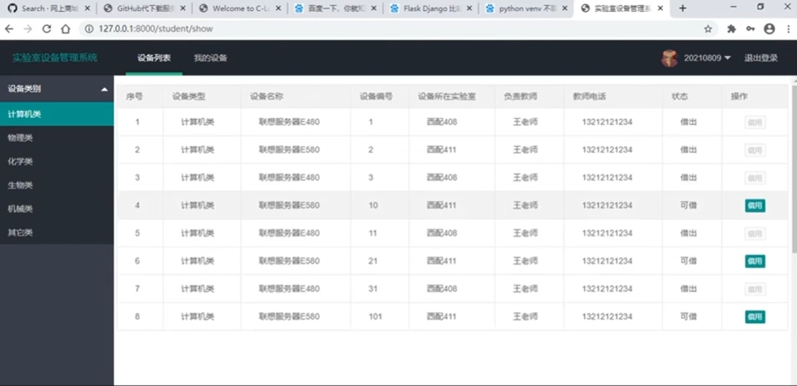 针对设备信息管理功能,分别对设备信息录入、查询、借用、归还、维护提醒等子功能进行测试。在设备信息录入测试中,通过手动录入与图像识别录入两种方式输入设备信息,检查录入信息是否准确存储到数据库,字段校验功能是否有效防止错误信息录入。在设备信息查询测试中,使用多条件组合查询(如设备名称+使用状态、借用人员+设备类别)与模糊查询功能,验证查询结果是否准确、完整,查询响应时间是否在可接受范围内。在设备借用与归还测试中,模拟用户提交借用申请、管理人员审批、用户归还设备等流程,检查借用记录、归还记录是否正确更新,设备状态是否及时切换。对于维护提醒功能,根据设备购置日期、保修期、使用频率等信息,检查维护提醒是否在规定时间准确发送。经测试,设备信息管理功能各项子功能均能正常运行,满足实验室设备管理业务需求。如下图6-2、6-3、6-4所示为实验室设备管理系统的情况展示。