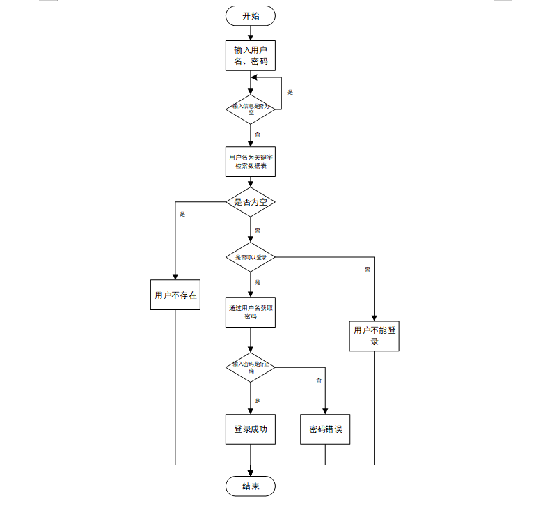 用户输入用户名和密码后,系统先检查输入是否为空,再验证用户名是否存在,若存在则通过用户名获取密码并校验。若密码正确则登录成功,否则提示密码错误。若用户名不存在或无法登录,提示用户操作无效。如图3-4所示。