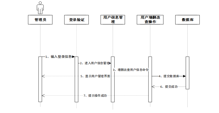管理员输入登录信息后,进入用户信息管理模块,选择增删改查操作并提交命令至数据库。数据库执行操作后返回成功状态,系统显示用户管理界面并提示操作成功。管理员修改用户信息时序图如图4-5所示。
